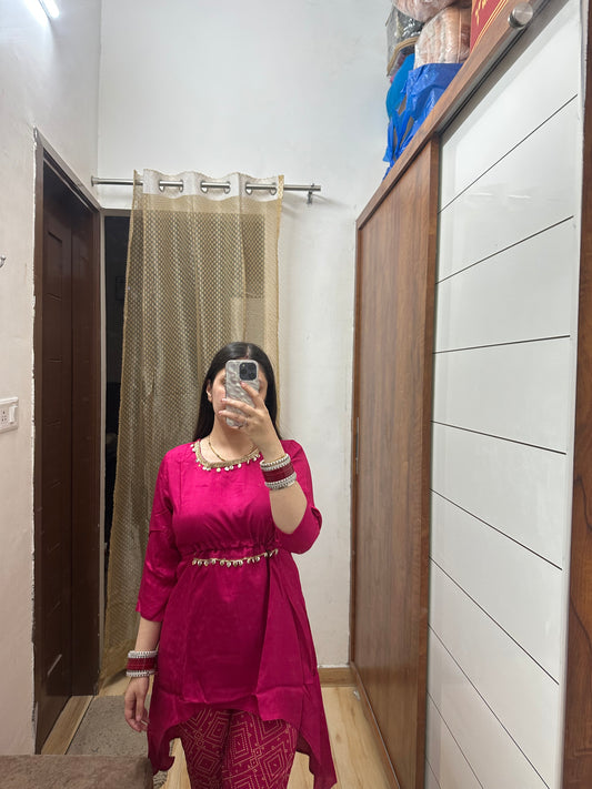 Pink High-Low Kurta Set with Embellished Waist & Bandhej Pants