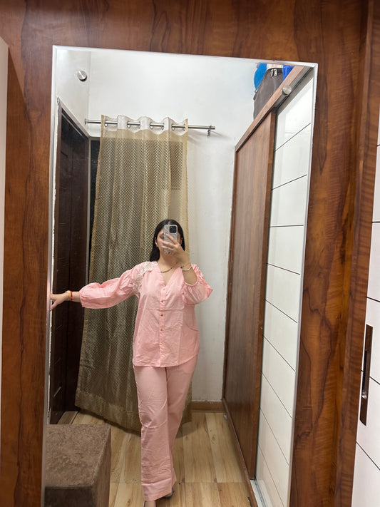 Peach Cotton Coord Set with Puff Sleeves Shirt