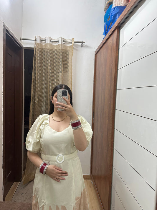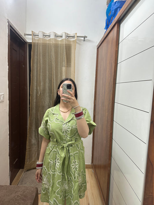 “Off-White Hand-Embroidered Cotton Dress with Floral Details & Belt”