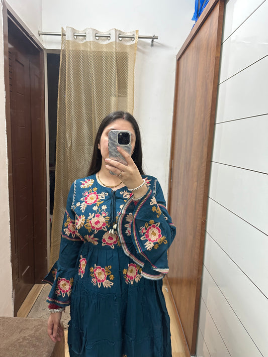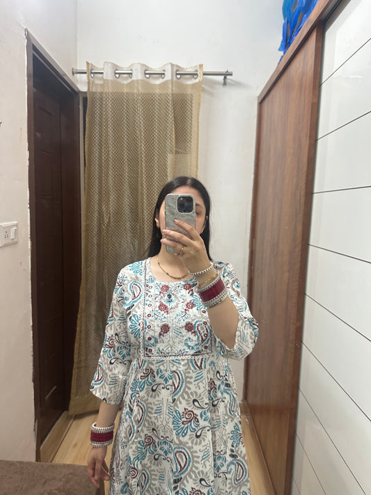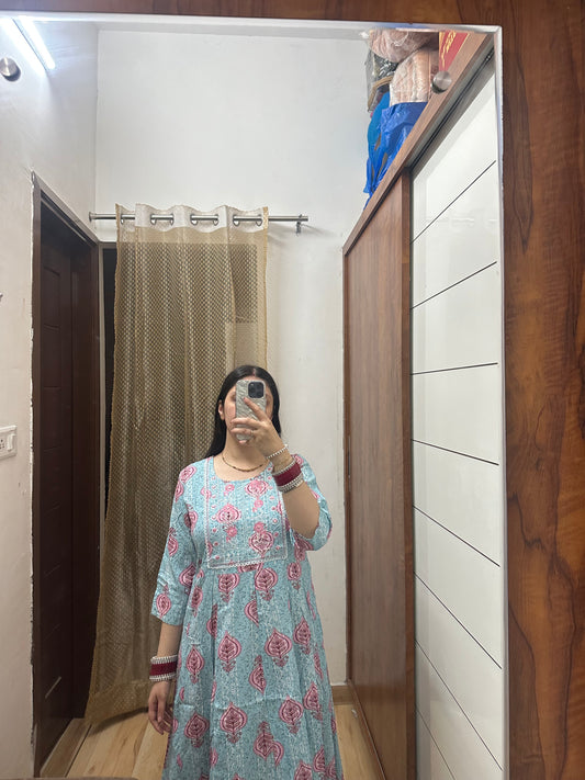 Graceful Blue Floral Printed Cotton One-Piece Dress – Perfect for Casual and Summer Wear