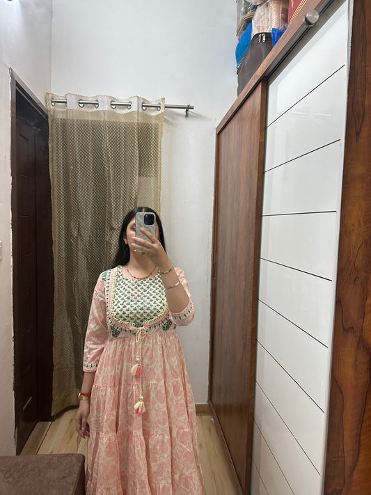 Pastel Pink Printed Anarkali Dress with Mirror Work Yoke
