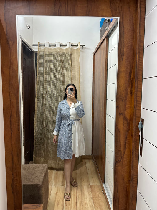 Women’s Half and Half Shirt Dress – Blue Printed and White Belted Shirt Dress