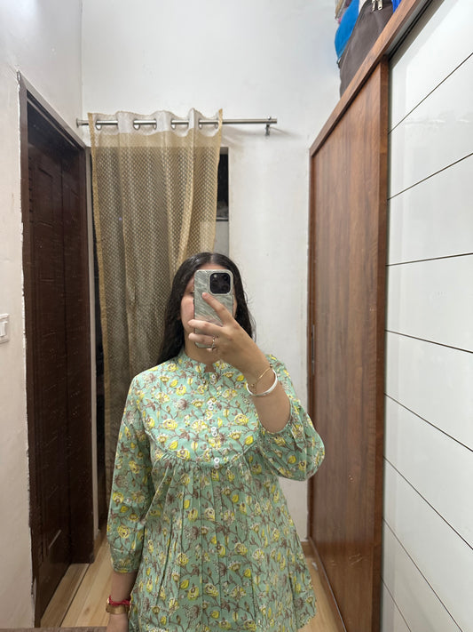 Pastel Green Floral Cotton Kurti Top – Pintuck Yoke & A-Line Fit