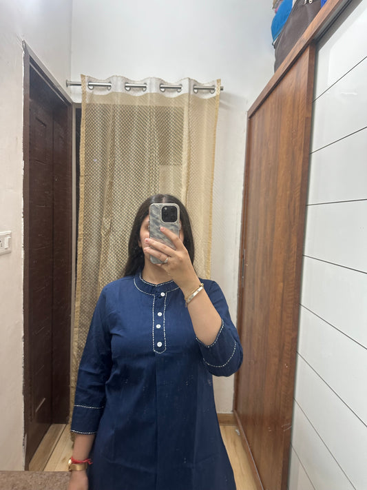 Solid Navy Blue Cotton Kurti Top – Pleated Front with Stitch Detailing