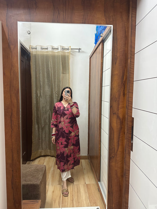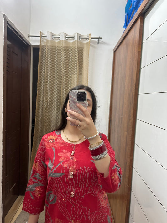 Elegant Red Cotton Kurta with Floral Print