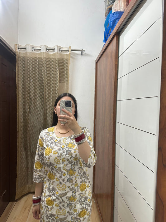 White & Yellow Floral Handblock Printed Cotton Kurta – Effortless Elegance