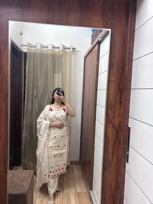 Ivory Strappy Suit Set with Red Heart Embroidery
