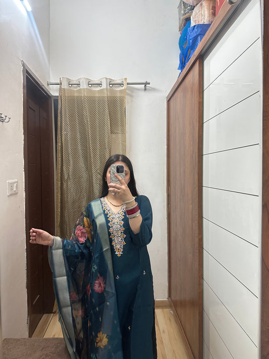 Navy Blue Embroidered Suit Set with Floral Dupatta