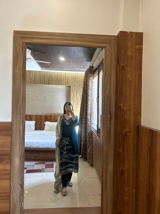 Teal Cotton Asymmetrical Kurta Set with Floral Embellishments