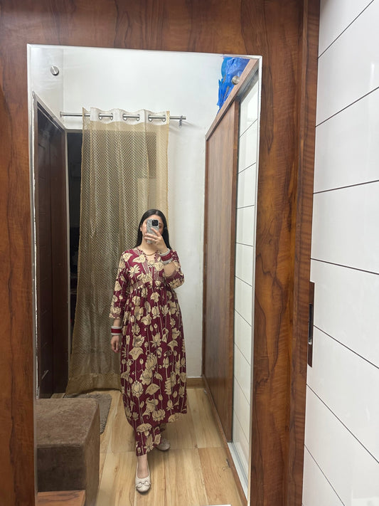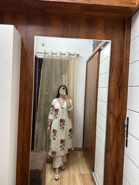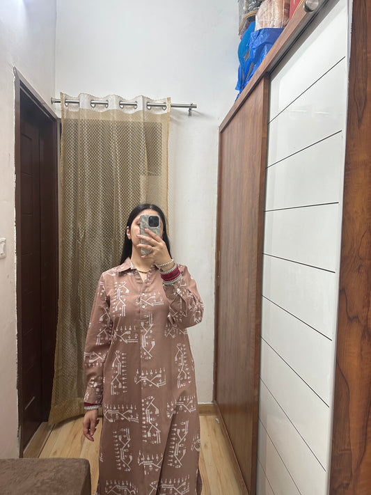 Elegant Brown Printed Co-Ord Set with Shirt-Style Kurta