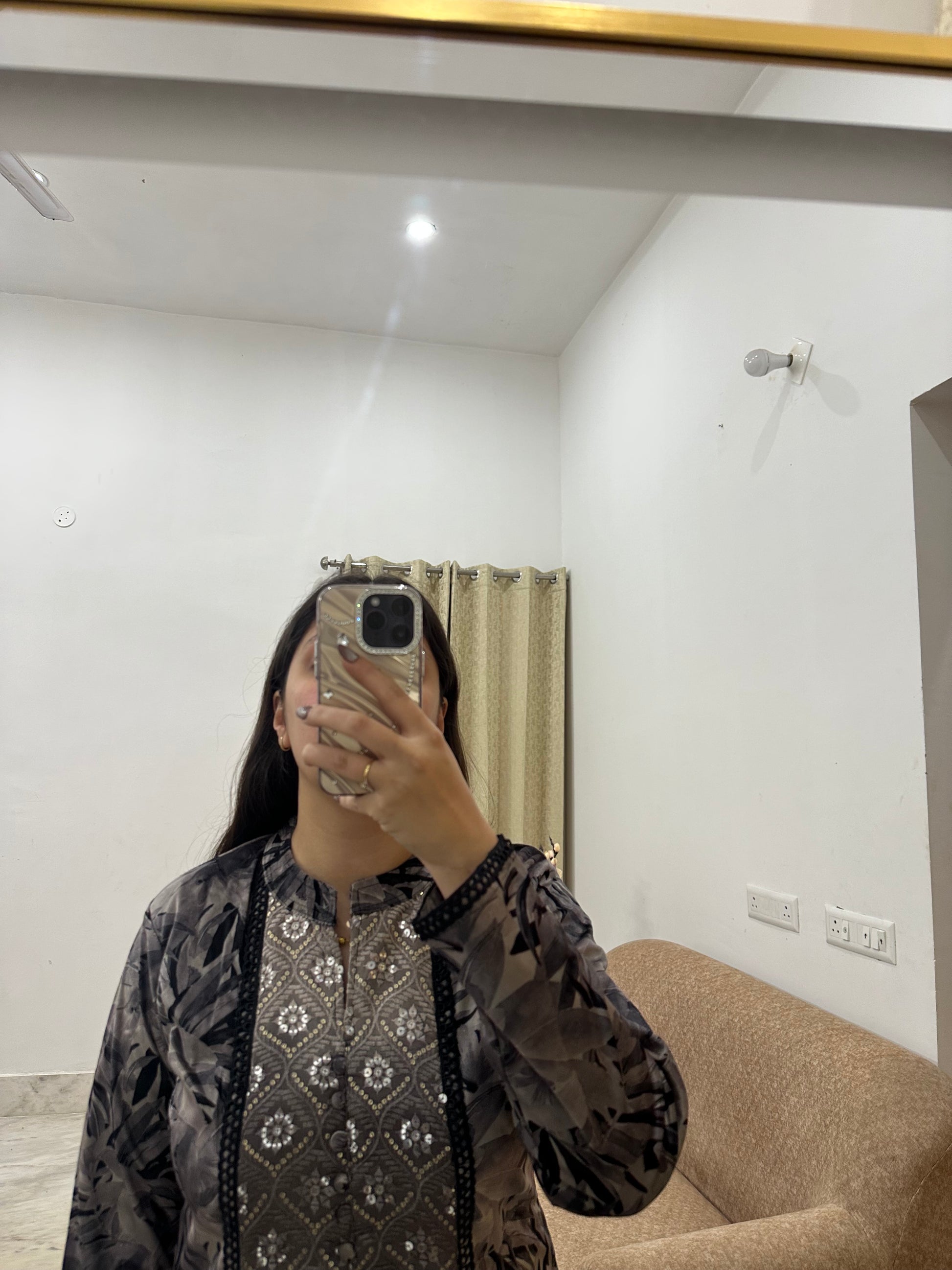 Keep your winter look effortlessly stylish with this black and grey printed kurta set featuring an attached full-sleeve overlay design (not a jacket). The kurta has a beautifully detailed geometric print on the front, complemented by an all-over abstract print on the sleeves and sides, giving it a layered look in a single piece. Paired with comfortable straight-fit pants, this ensemble offers a smart, modern silhouette while keeping you warm and comfortable.