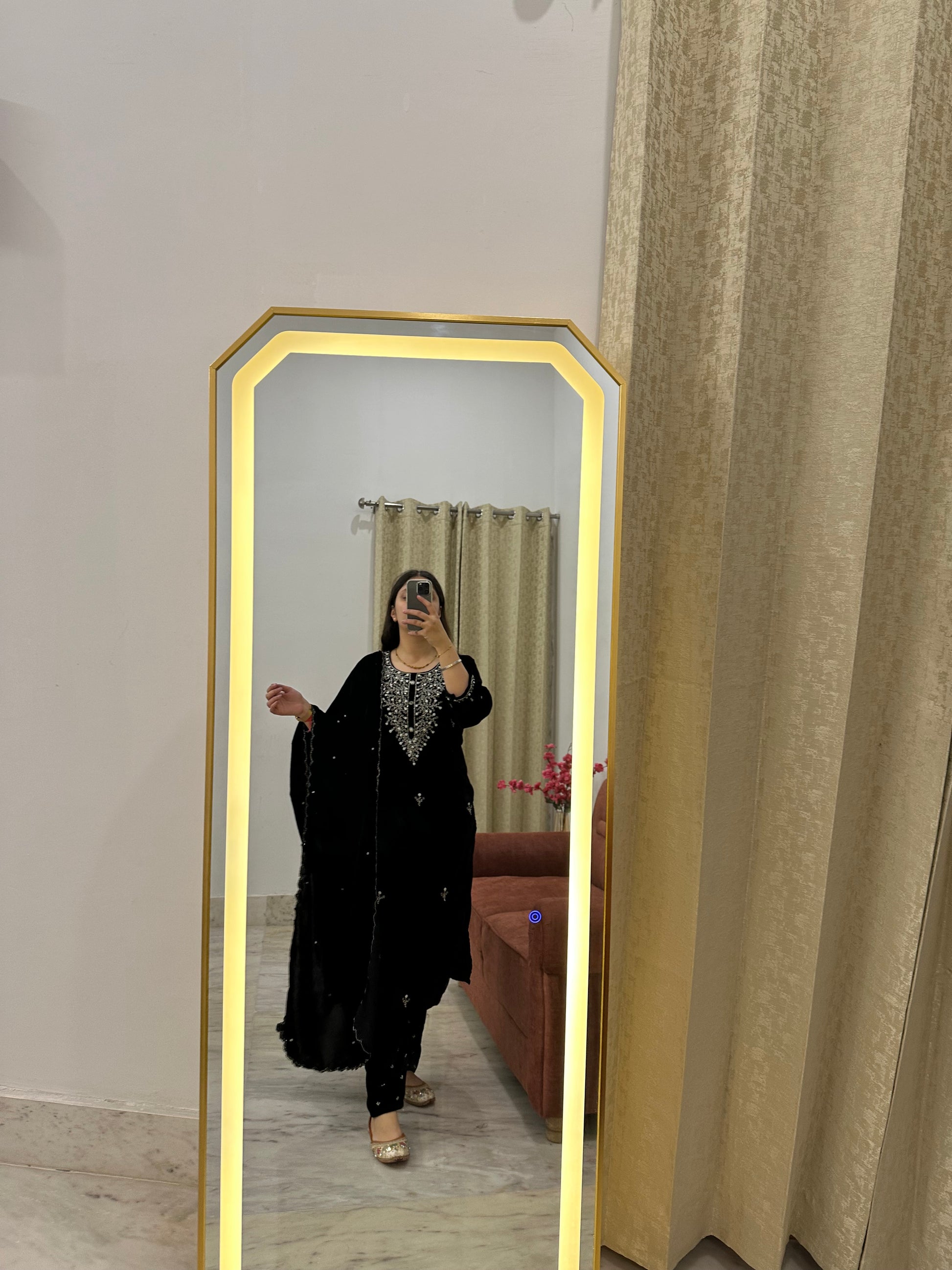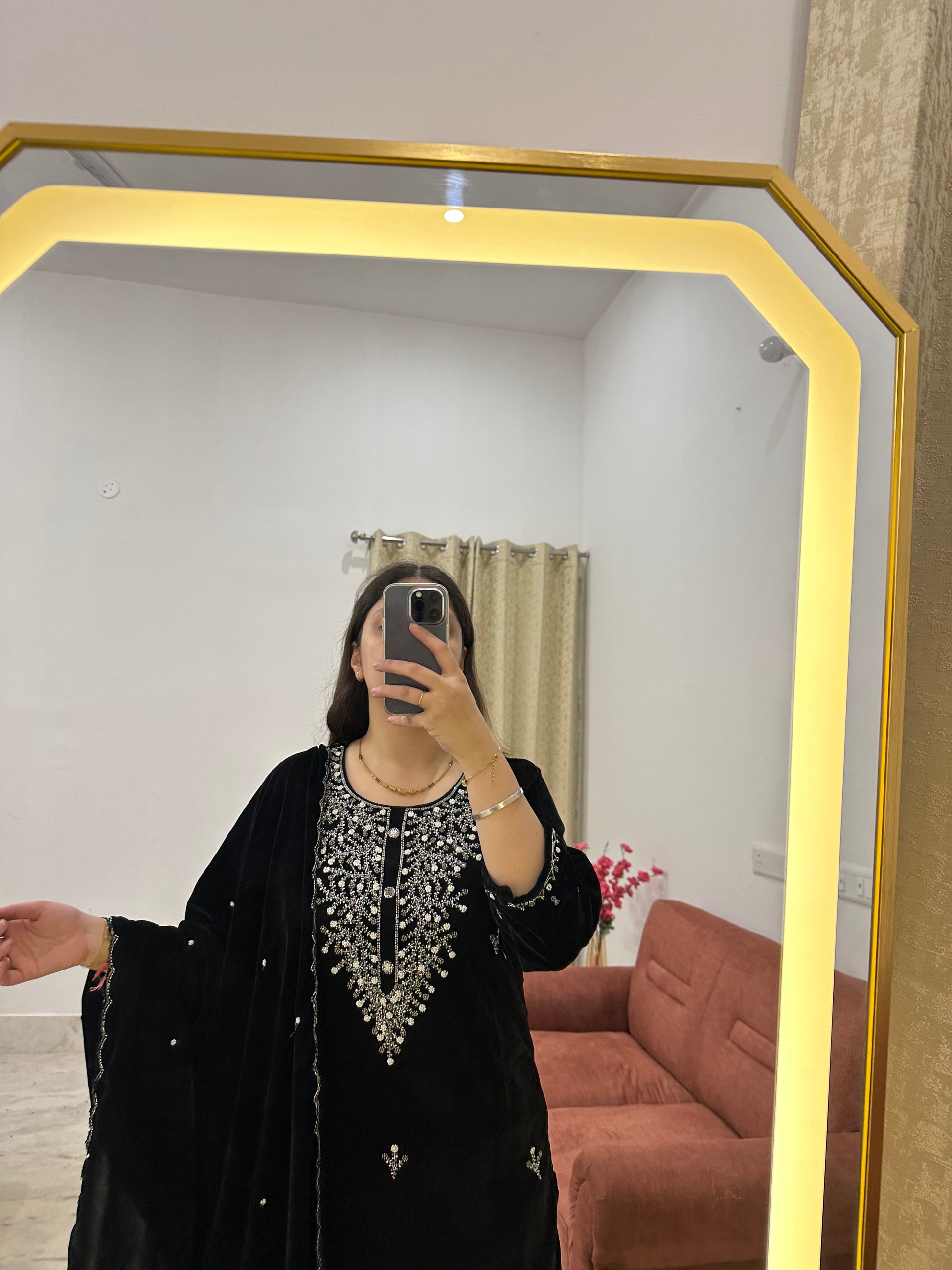 Step into timeless elegance with this luxurious black velvet suit, adorned with intricate hand embroidery on the neckline and scattered motifs across the kurta and dupatta. Crafted from premium soft velvet, it offers both comfort and regal charm—perfect for winter festivities, evening events, and wedding gatherings.