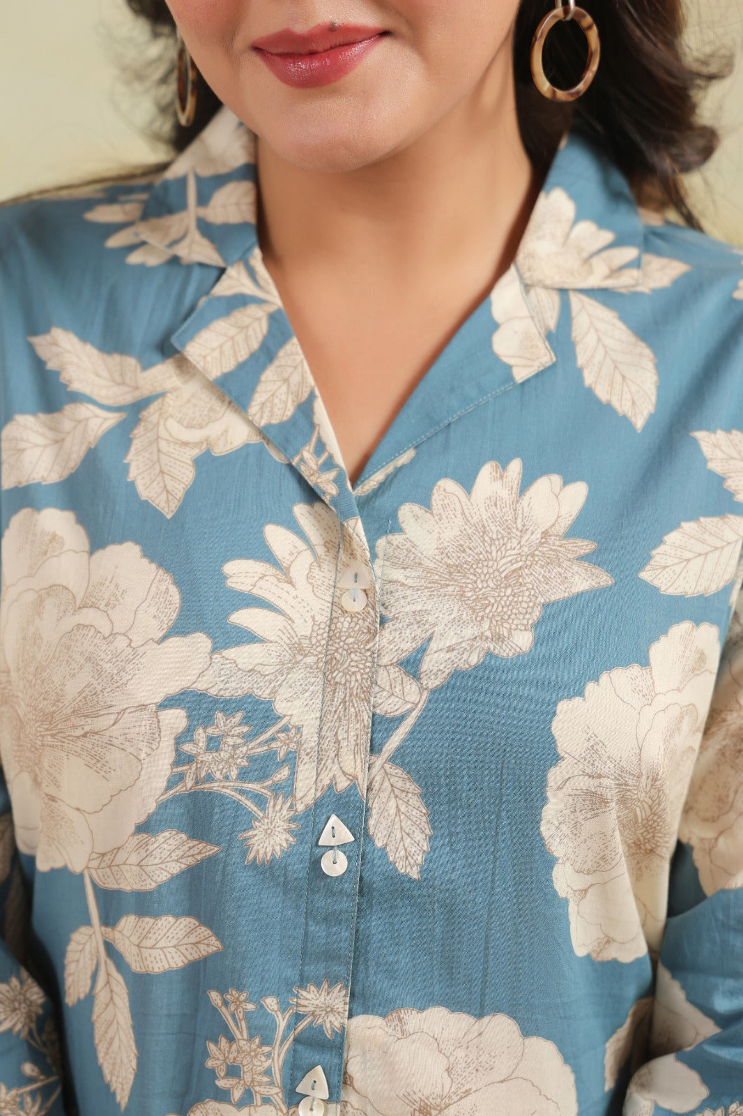 • Soothing dusty blue shade • Premium breathable cotton fabric • Elegant ivory floral print • Button-down top with collar neckline • Three-quarter sleeves • Straight-fit coordinated trousers • Relaxed, comfortable fit • Easy everyday wear