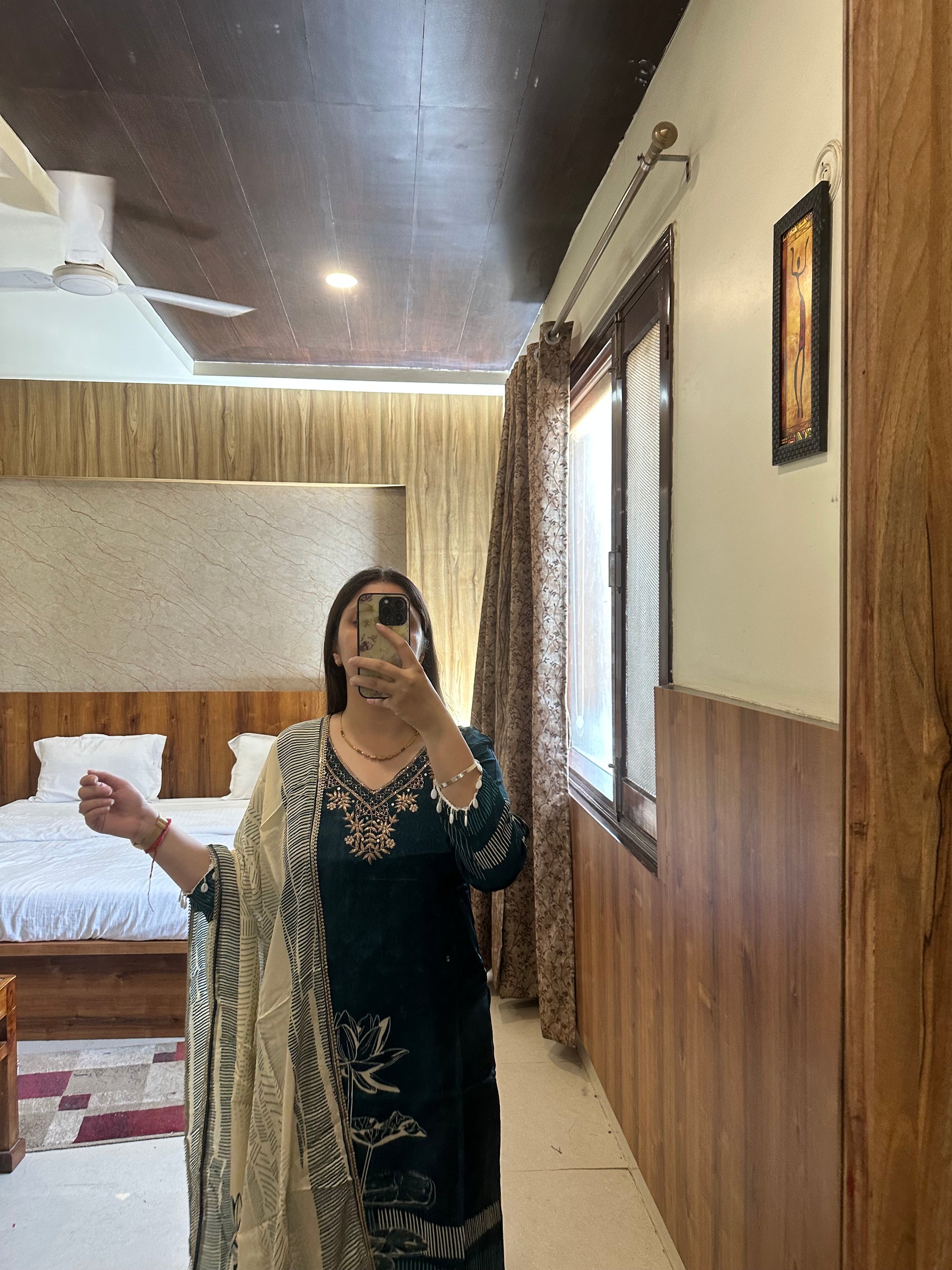 Fabric: Pure Crepe suit with Muslin embellished dupatta