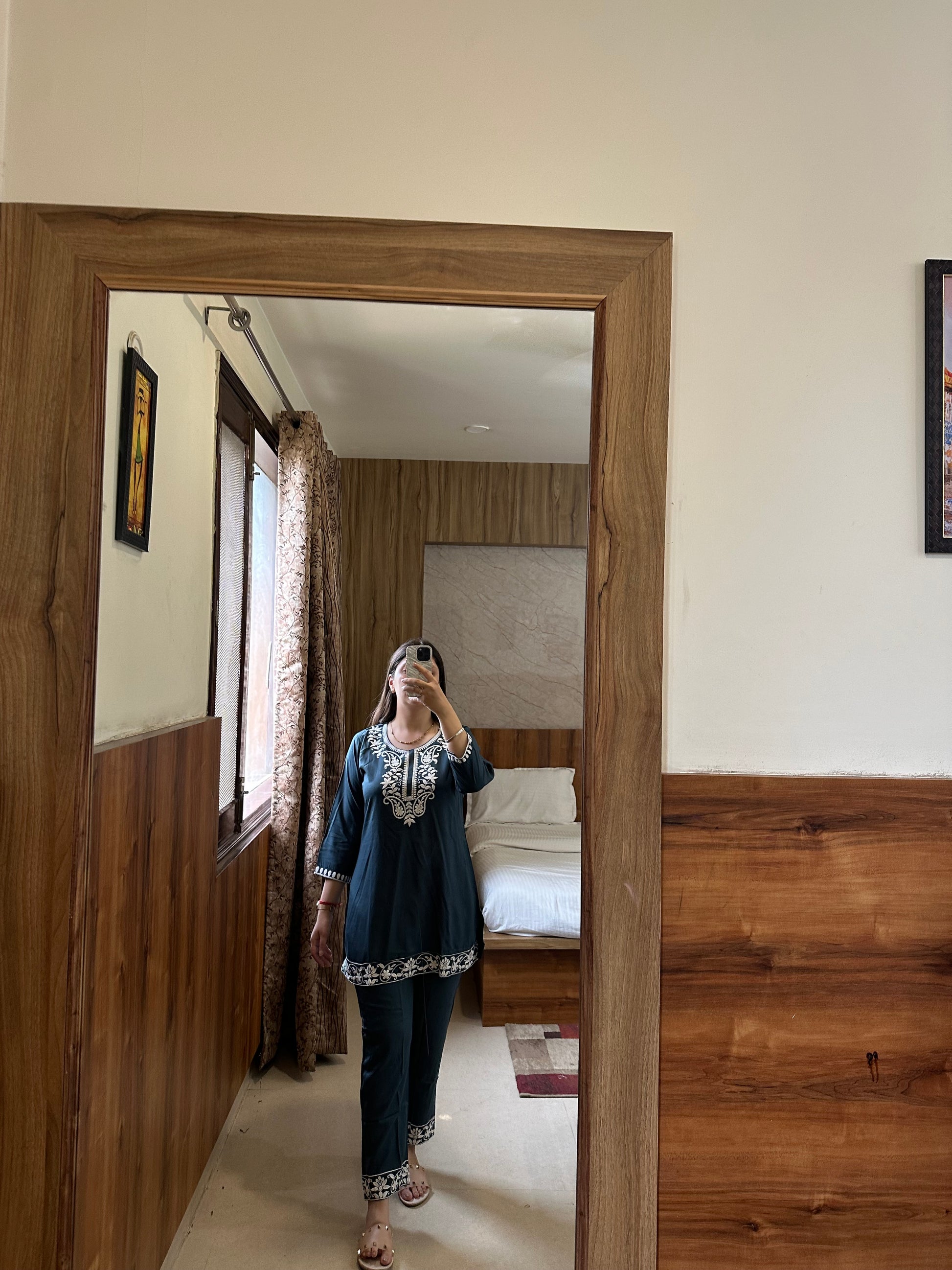 Step into effortless elegance with this teal cotton kurta set, adorned with intricate white thread embroidery along the neckline, hemline, cuffs, and pant edges. The soft, breathable fabric ensures all-day comfort, while the straight-cut silhouette flatters every body type. Perfect for casual outings, festive gatherings, or everyday wear, this set blends traditional detailing with modern simplicity. Pair it with juttis or sandals for a complete ethnic look.